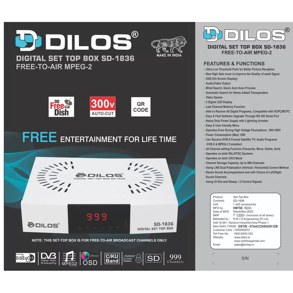 This is a newly launched MPEG-2 set-top box from the Dilos brand for receiving MPEG-2 Satellite free-to-air TV channels. It will work with C/Ku-Band satellite TV signals. It is also best for receiving Satellite radio channels in India. It is best suitable for MPEG-2 DD Free dish TV channels.